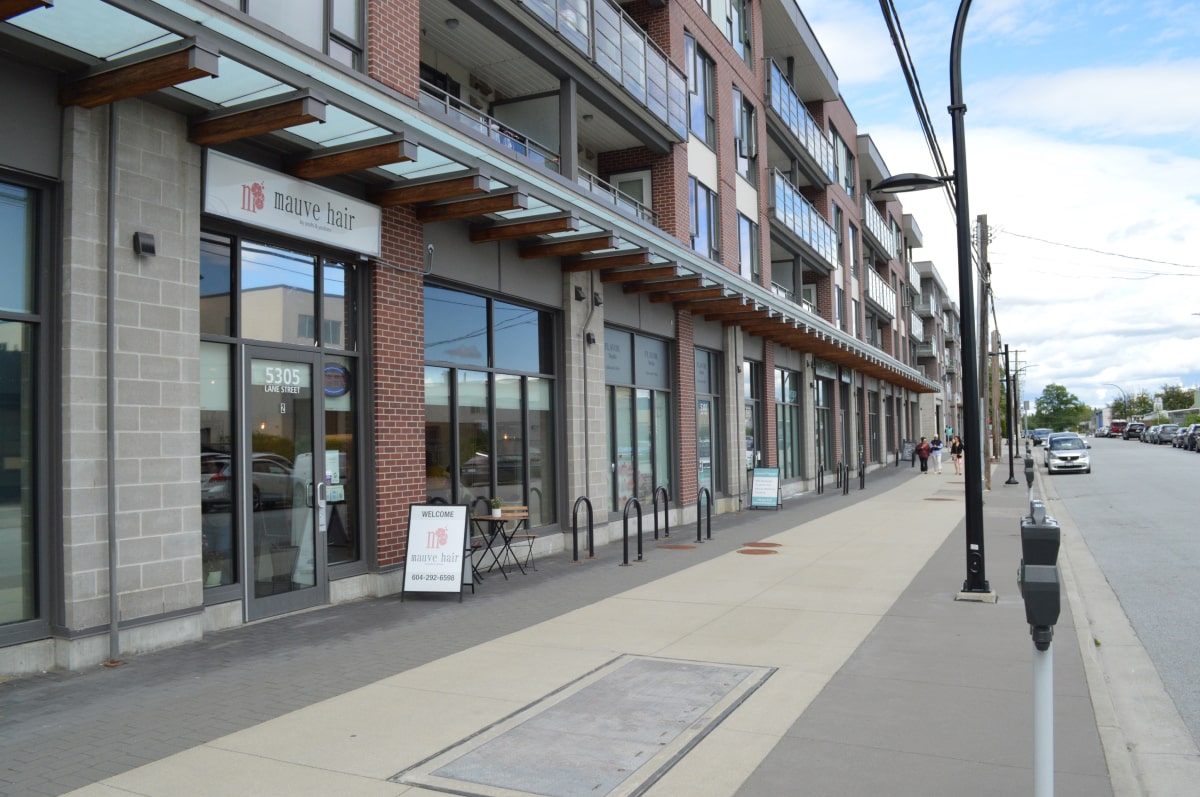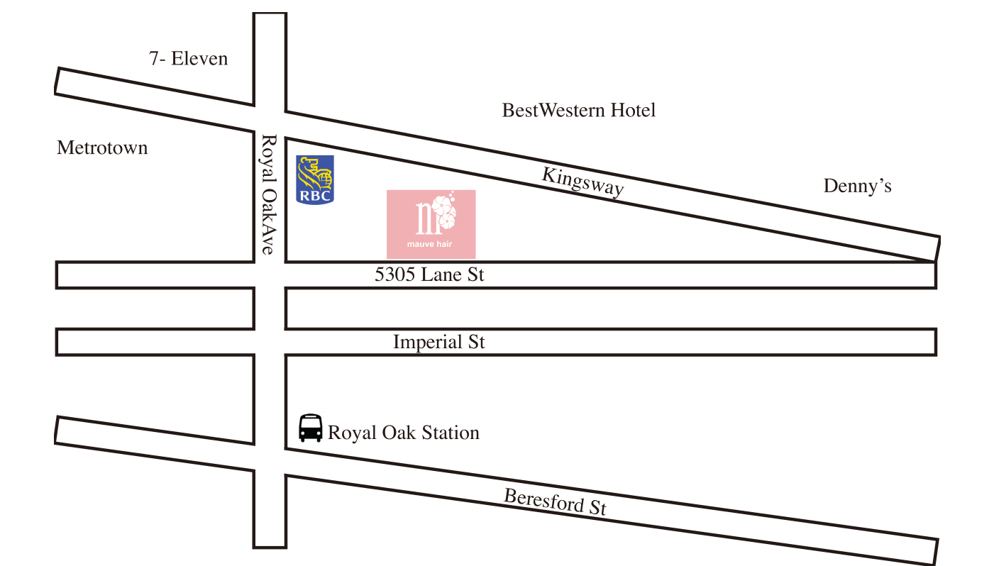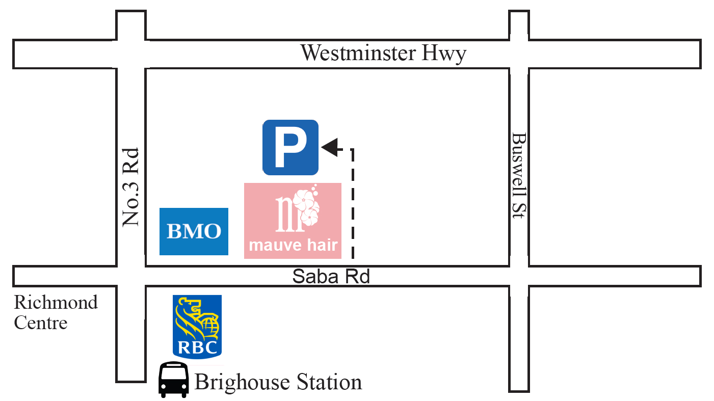 Toward north after exit the station, turn right at the corner of 1st traffic light (BMO Bank), mauve hair located on the 1st floor of retail of Paloma 2 residential condo.